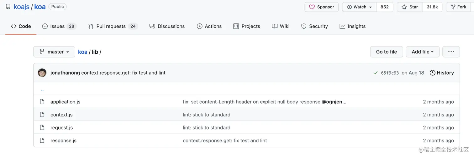 Koa的核心文件一共有四个:application.js、context.js、request.js、response.js。所有的代码加起来不到 2000 行,十分轻便,而且大量代码集中在 request.js 和 response.js 对于请求头和响应头的处理,真正的核心代码只有几百行。