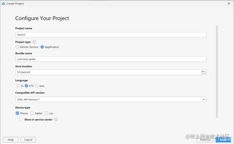 将文件命名为SaoLei(文件名不能出现中文或者特殊字符,否则将无法成功创建项目文件),Project Type勾选Application,选择保存路径,Language勾选eTS,选择API7,设备勾选Phone,最后点击Finish按钮。