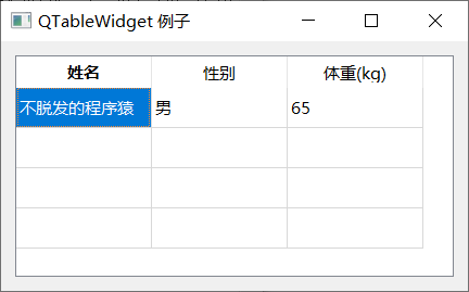 示例中, 构造了一个QTableWidget对象,并且设置表格为4行3列。生成了一个QTableWidgetltem对象,名称为“不脱发的程序猿”。