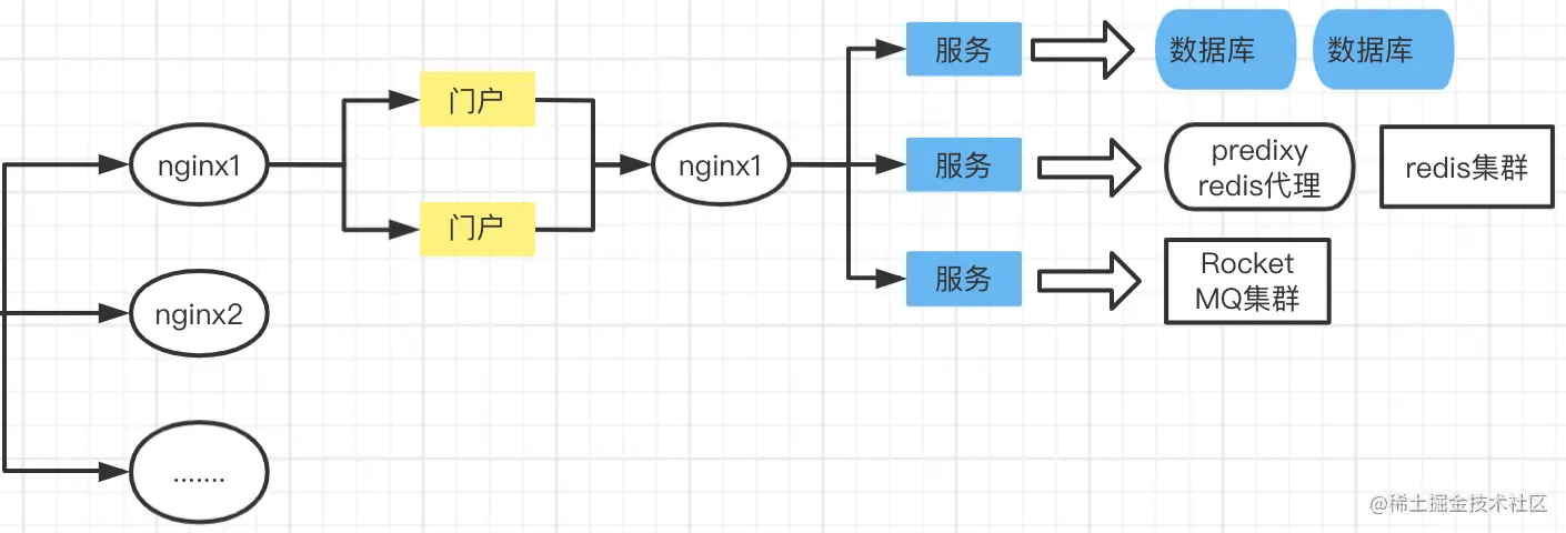 nginx负载均衡,每一组nginx对应两个门户集群,每个门户对应三个服务集群