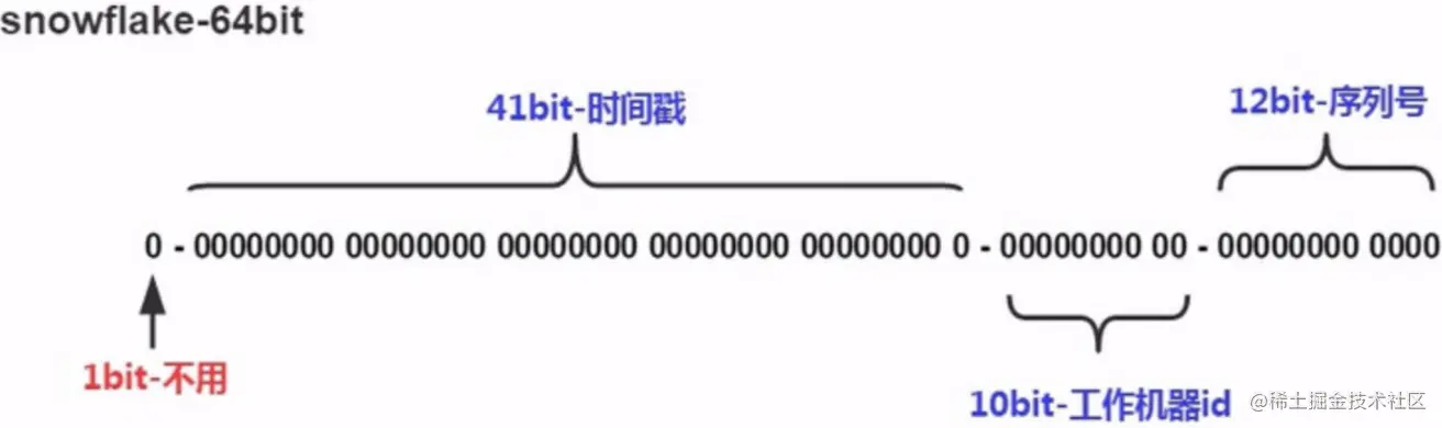 SnowFlake算法生成id的结果是一个64bit大小的整数,它的结构如下图: