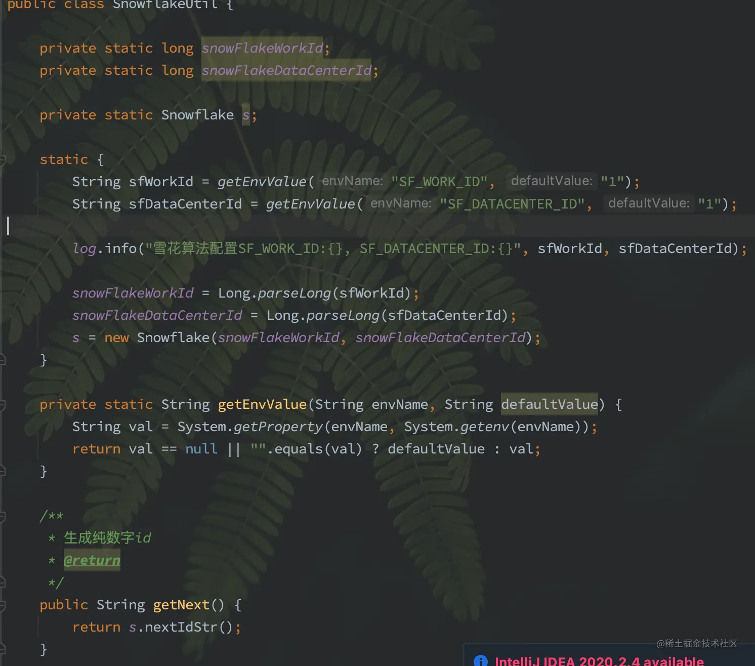 static { String sfWorkId = getEnvValue("SF_WORK_ID", "1"); String sfDataCenterId = getEnvValue("SF_DATACENTER_ID", "1"); log.info("雪花算法配置SF_WORK_ID:{}, SF_DATACENTER_ID:{}", sfWorkId, sfDataCenterId); snowFlakeWorkId = Long.parseLong(sfWorkId); snowFlakeDataCenterId = Long.parseLong(sfDataCenterId); s = new Snowflake(snowFlakeWorkId, snowFlakeDataCenterId);}