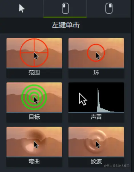 2. 左键点击动态与声音。通过添加效果使鼠标点击操作更能吸引注意力,如:波纹、范围、声音等。