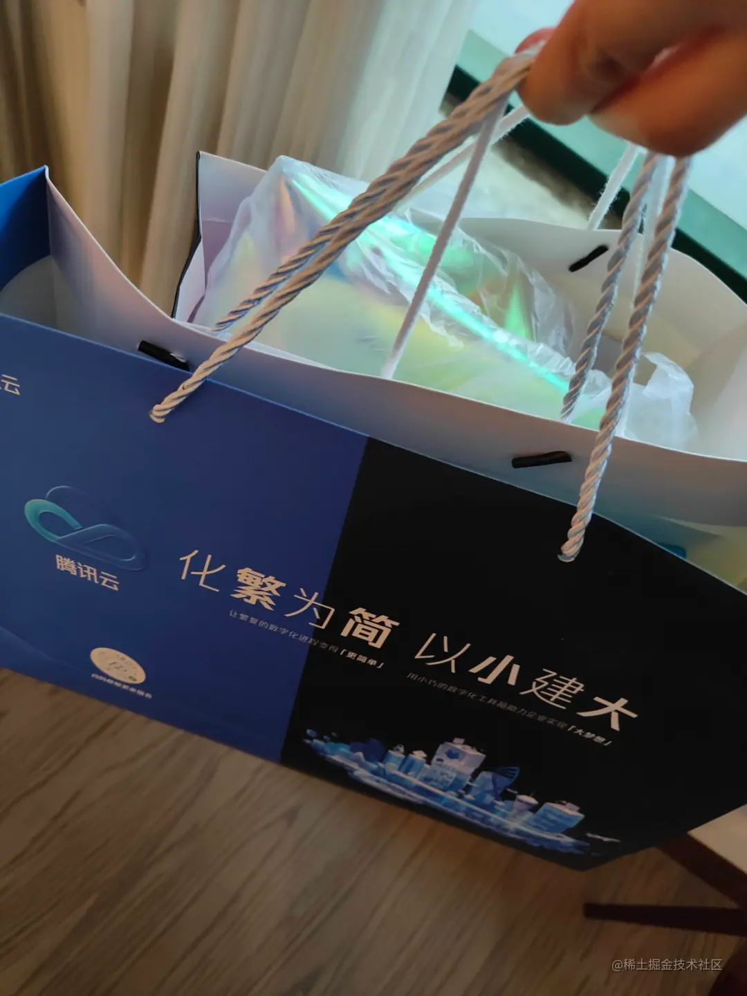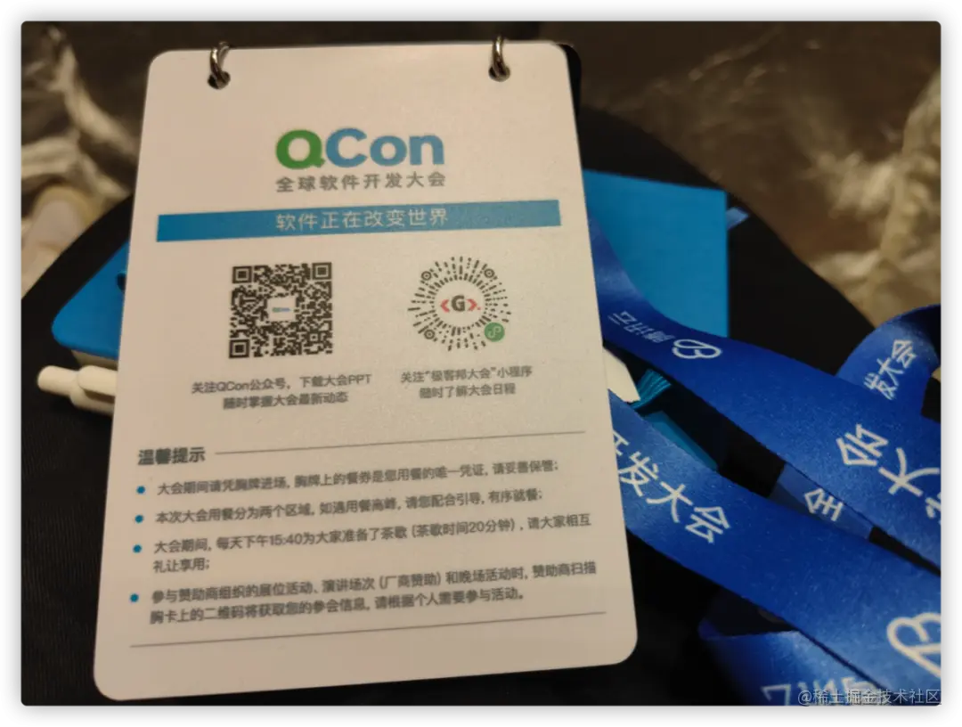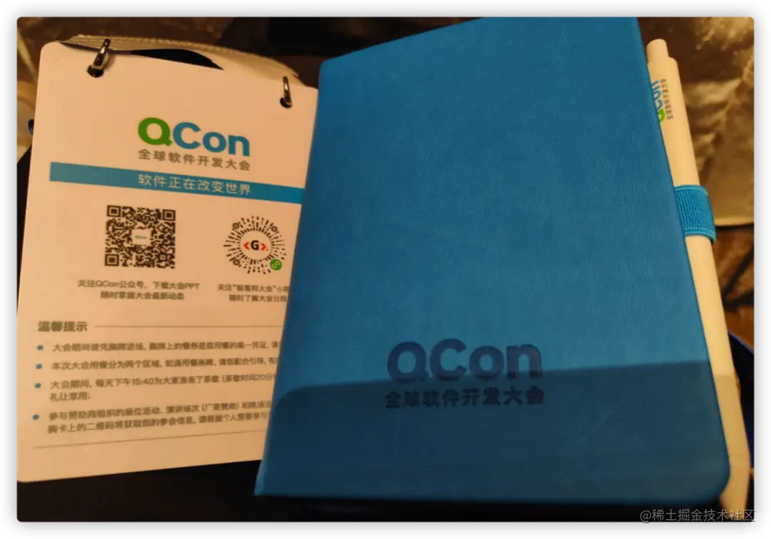 签完到会每人发一个袋子和一个参会牌。袋子装的是会议日程表、一个笔记本、QCon介绍以及部分赞助商小册子等。