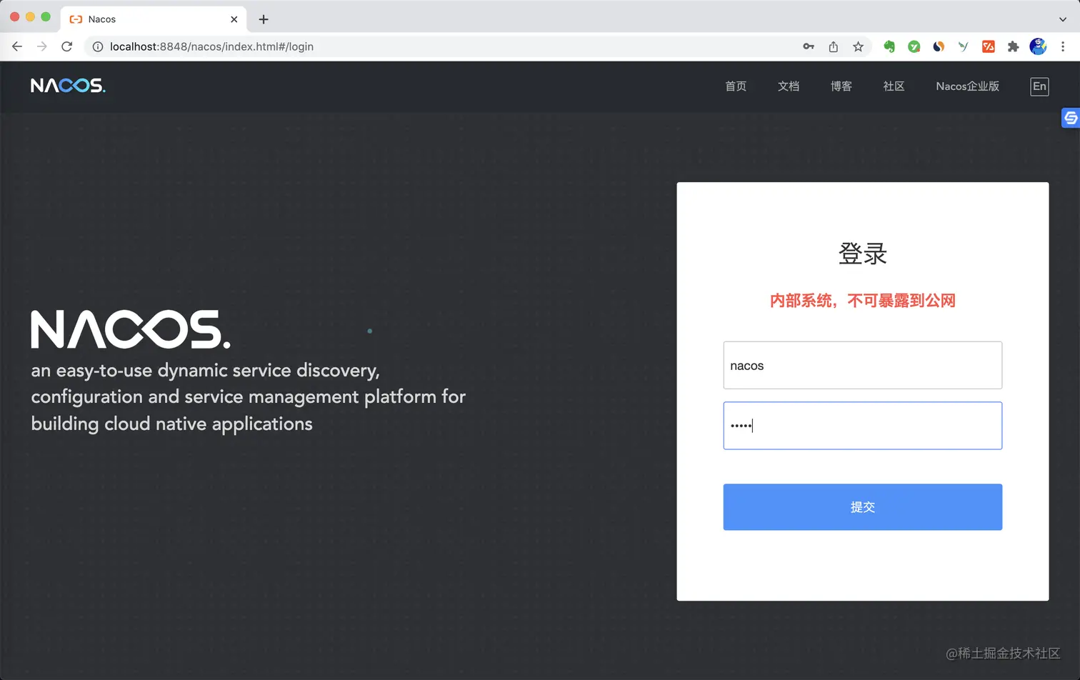 账号密码默认都为 nacos,如图