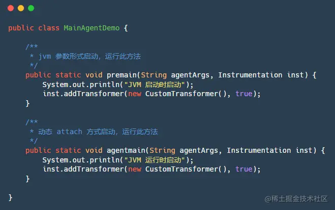 上面我们已经说到了有两处地方可以进行 Java Agent 的加载,分别是 目标JVM启动时加载 和 目标JVM运行时加载,这两种不同的加载模式使用不同的入口函数:
