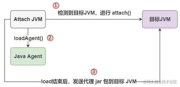 上面代码十分简易的实现了 Attach 的方式,通过寻找当前系统中所有运行的 JVM 进程,然后通过比对 PID 来筛选出目标JVM,然后让 Agent 附着在目标 JVM 上。当然这边已经简易到直接在代码中指定目标JVM的 PID,这种方式在实际生产中是十分不可取的,我们可以通过动态参数的方式传入 PID~!而 Attach 的执行原理也不复杂,简单流程如下: