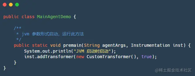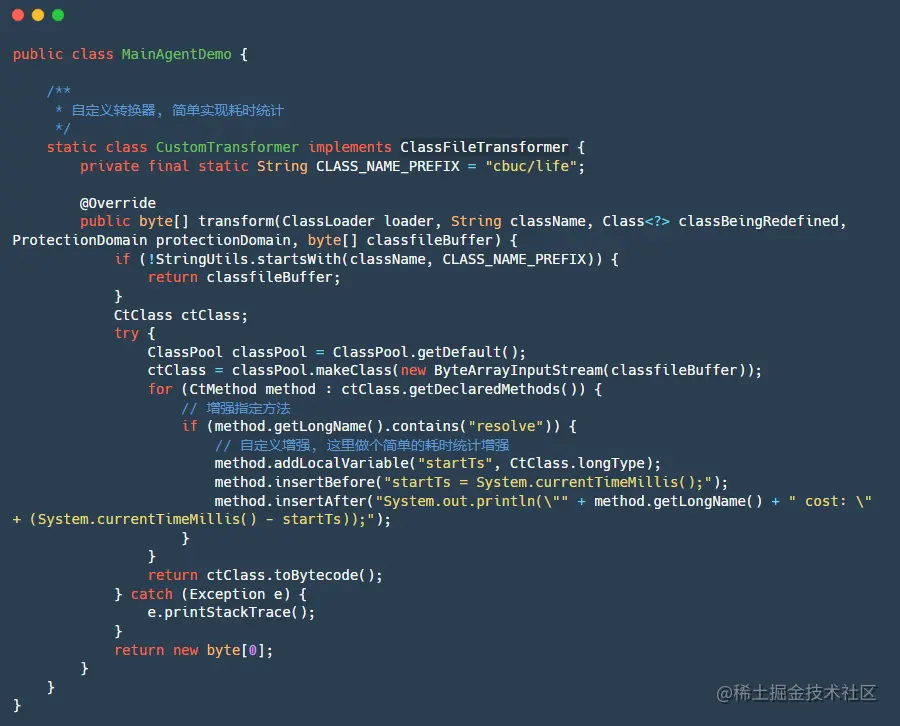 加入一个转换器 Transformer ,之后所有的目标类加载都会被 Transformer 拦截,可自定义实现 ClassFileTransformer 接口,重写该接口的唯一方法 transform() 方法,返回值是转换后的类字节码文件