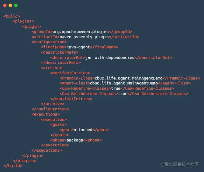 然后将 Agent 打包,打包的时候需要在 pom.xml 文件中添加以下内容