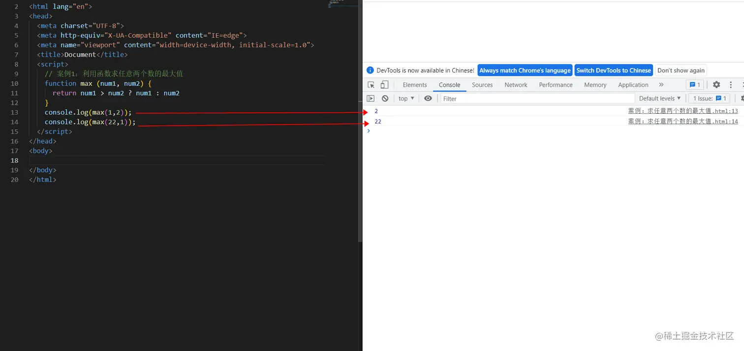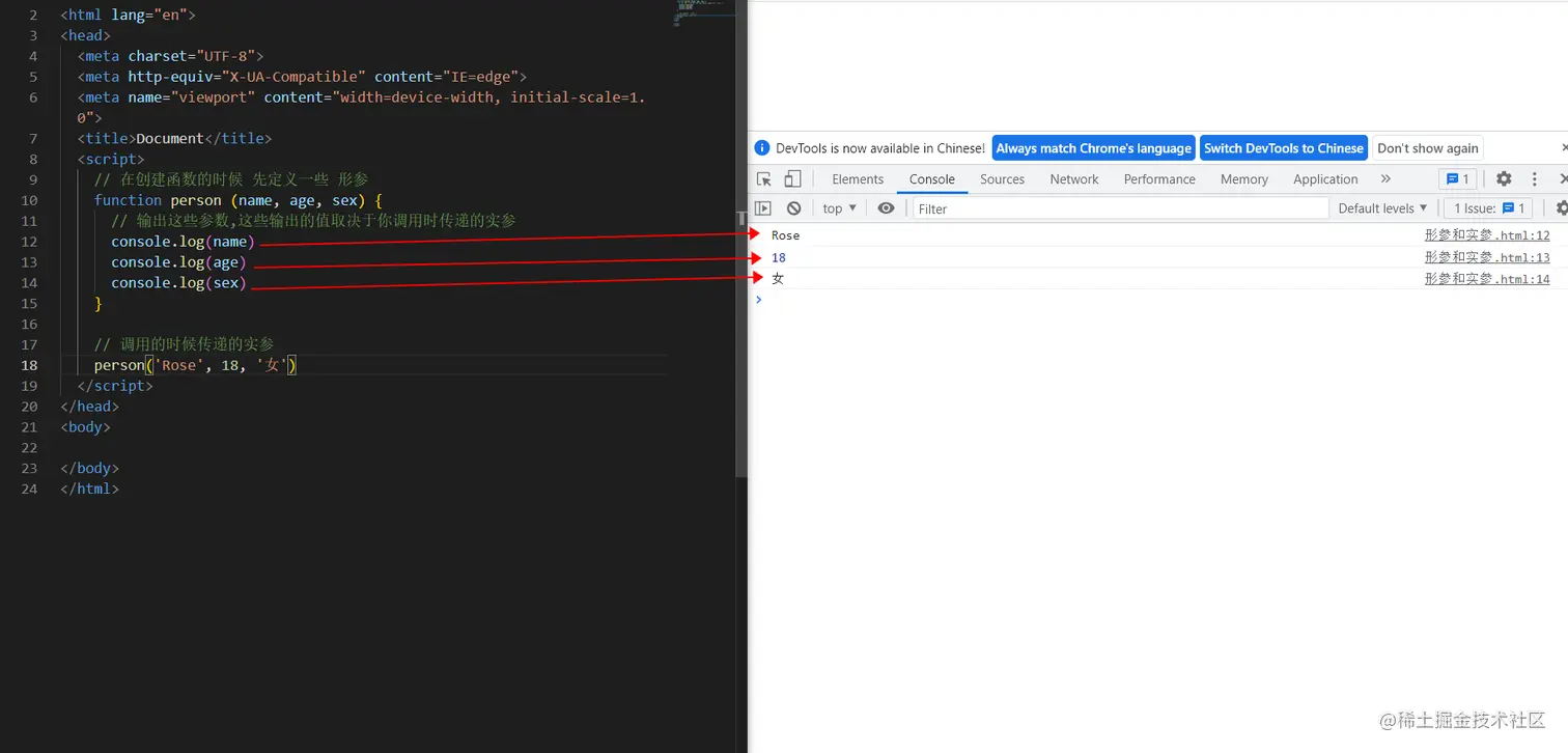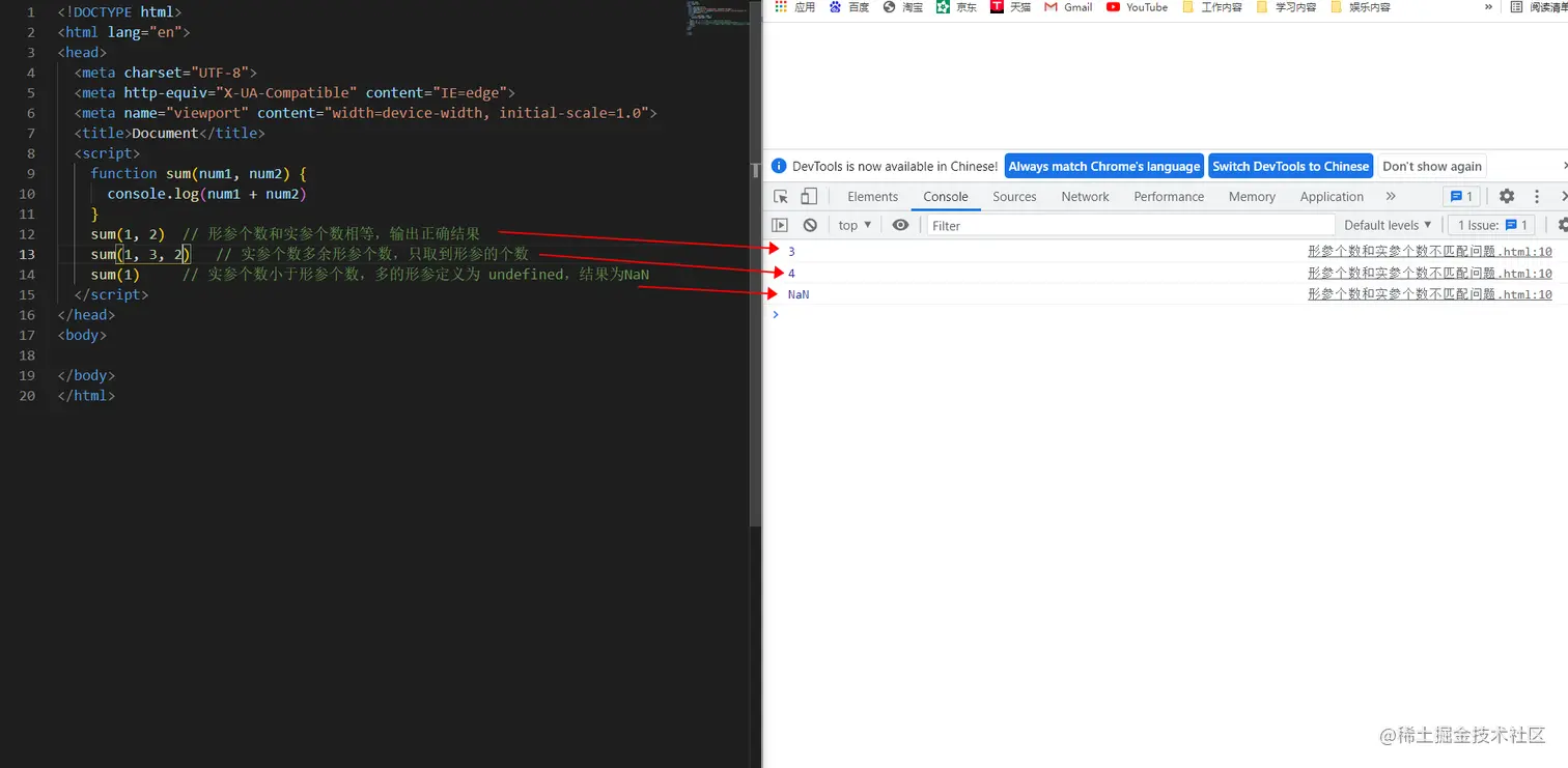 function sum(num1, num2) { console.log(num1 + num2)}sum(1, 2) // 形参个数和实参个数相等,输出正确结果sum(1, 3, 2) // 实参个数多余形参个数,只取到形参的个数sum(1) // 实参个数小于形参个数,多的形参定义为 undefined,结果为NaN