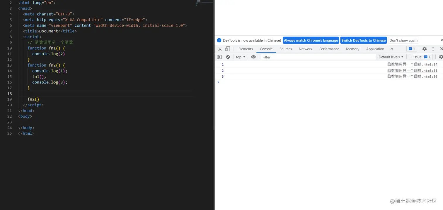 // 函数调用另一个函数 输出 123function fn1() { console.log(2)}function fn2() { console.log(1); fn1(); console.log(3);}fn2()