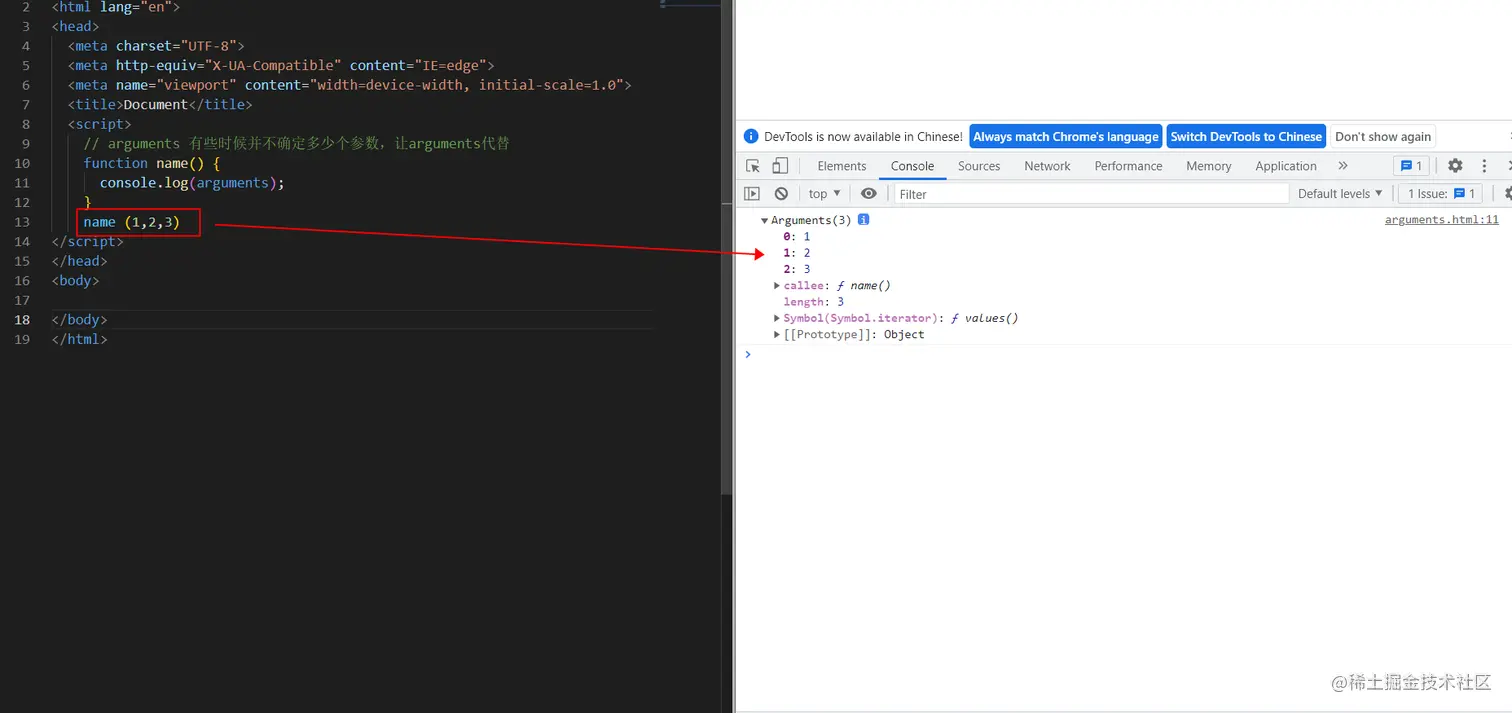 // arguments 有些时候并不确定多少个参数,让arguments代替function name() { console.log(arguments);}name (1,2,3)