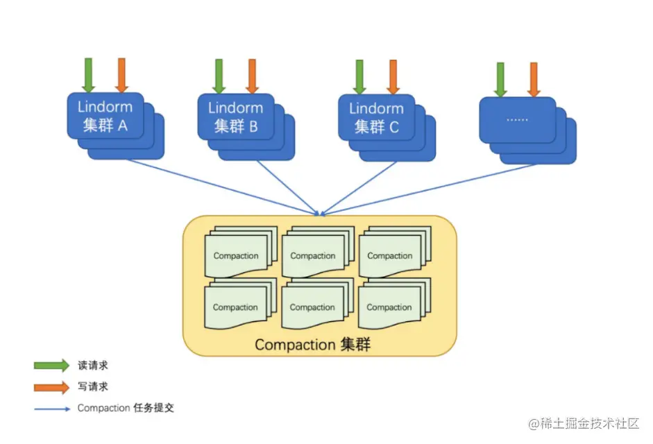 可以将 Compaction 任务看做周期执行的离线任务,而读写服务是实时在线服务,问题的根节在于离线任务和实时在线任务强耦合在一起,导致两者相互影响,扩缩容不灵活。基于这个洞察,Lindorm 实现了 Offload Compaction 功能,支持 Compaction 任务以独立的进程运行在独立的机器上,一方面服务读写请求的机器不会再因为 compaction 任务的运行产生抖动,另一方面运行 Compaction 任务的机器可以充分利用机器资源,无需担心影响在线服务,更值得一提的是,db 运维可以搭建巨大的 Compaction 任务集群进行统一管理,根据任务的多少按需扩缩容,极大地简化了运维成本。