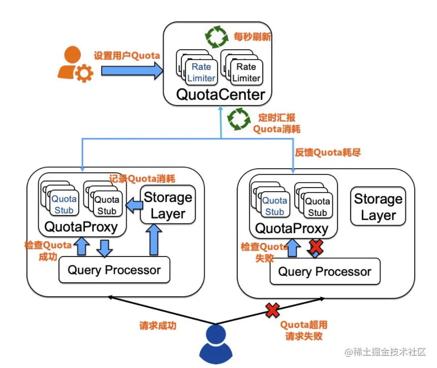 - Quota 消耗由 QuotaProxy 异步定期汇报,QuotaCenter 不会成为系统的单点,QuotaCenter 的压力与用户请求量无关