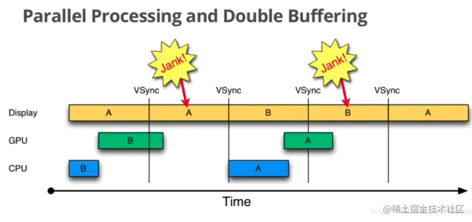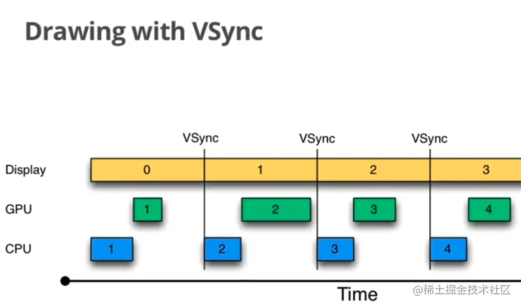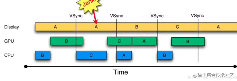 在第一个时间间隔的时候,cpu正常执行帧1,gpu渲染帧1,屏幕正常展示帧1;第二个时间间隔的时候,cpu由于被占用,推迟执行了帧2,导致了只能展示上一帧,即帧2。这时就需要vsync信号