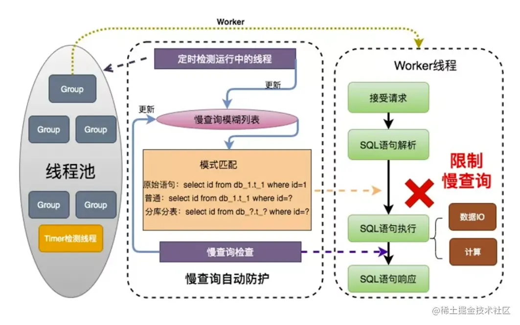 在普通SQL语句执行之后, 判断其是否是慢查询, 是则插入到慢查询模式列表中根据既定的Slow Query检测策略, 周期性检测Threadpool,测算运行Thread当前执行的Query语句是否超时(Slow Query)。 如果是, 则将当前Slow Query的模式记录到模式列表中供过滤模块使用. 根据自定义的Slow Query类型, 还可以自定义该类型Slow Query对应的限流动作,该动作将在限流模块检测到匹配的Query后执行。