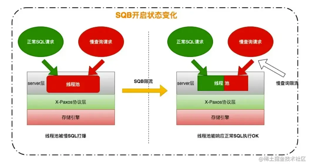 今年的双11,RDS内核做了深度优化,特别是分库分表级别的多点写、Statement Queue及慢SQL限流这块。针对业务系统大促态等特别业务场景,RDS在运行时短时间内突然收到大量的高资源占用的查询请求(例如慢SQL或者OLAP类请求或者极高并发的burst流量),将会造成此时间段内RDS内部的线程池资源被耗尽而无法对其他请求进行服务,从而使得整体性能急剧下降,对业务造成巨大影响,整个过程如下: