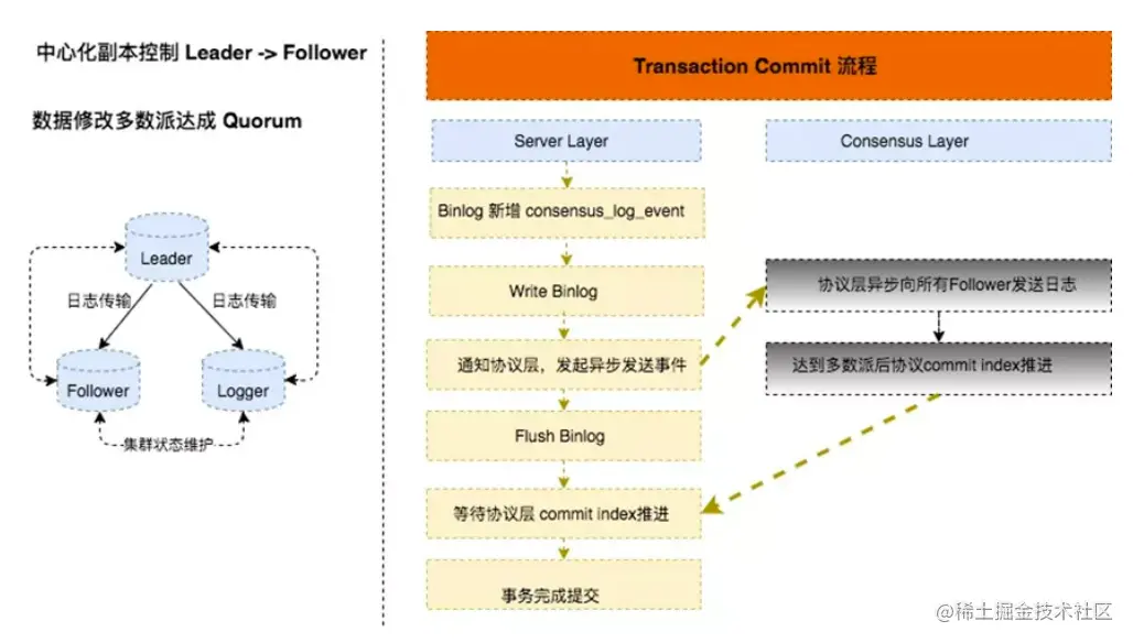 - Leader会把待提交的事务传输到其他节点,当达到多数派后在Leader节点上做事务提交;