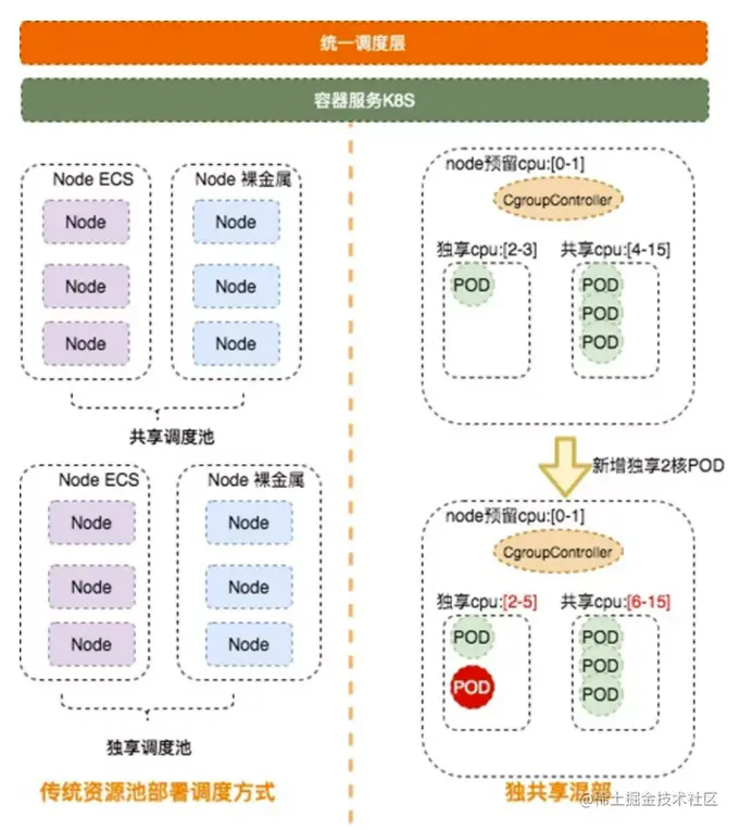 每年双十一核心集群会有独立部署要求,当性能出现临近点扩容时,就会造成资源浪费。今年新创的独共享混部能力,将核心集群的实例和其他长尾实例混部,实现资源整合。张北混部单元今年全面采用这项技术,节省CPU核心数量4.5万个;结合交易业务云盘化,张北单元整体大促成本下降 34.5%。在每个Node上,ECS主要分为几个资源模块。首先是主机预留,用于系统和对应管控组件,预留之外的都作为资源池给RDS使用,可分配独享实例(相当于进行绑核独享),也可以分配共享实例(相当于独享和预留之外的核数用于共享使用)。这里CgroupController除了需要能够为独享实例绑定CPU核心以外,还需要维护共享实例的CPU资源池。