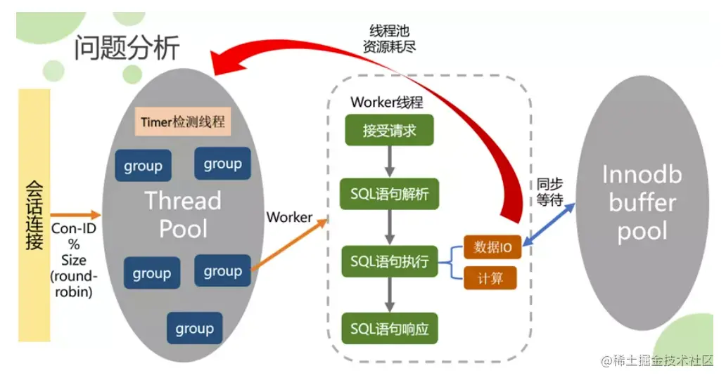 如上图, 一个Work线程会同步等待Innodb的读写结果, 因此在Query IO时间内, 线程资源被当前Query占据。Worker线程数量限制为Thread_pool_size *Thread_pool_oversubscribe, 当有大量Slow Query到来占据线程池资源, 则后续请求无法进去Worker被执行(或者进入线程池后因为IO资源被Slow Query占用而导致IO 等待, 进而恶化线程池资源地释放)。