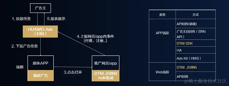 从上图可以看出,当广告主在华为平台做广告投放时,Ads下发广告任务,用户的点击行为、到后面的转化行为,包括注册、登陆、付费等行为,都是需要上报的,上报到华为Ads以后做归因的动作。整体来讲,整体流程核心的步骤是数据采集和上报,这部分由DTM完成,DTM对于广告转化最终来讲是非常重要的部分,因为从下图右边这个列表可以看出,追踪方式是有限的,而DTM既可以支持APP,也可以支持网页及web端的采集,这对使用者来说是非常有益的。