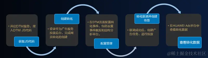 网页追踪的流程大概有5个步骤:获取JS代码、创建转化、配置管理、转化联调并创建任务、查看转化数据,在这五个模块里,获取JS代码和数据管理是核心的步骤,这两个也是由DTM完成的。