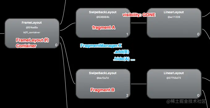 但是相比Activity,上个Activity的视图状态是VISIBLE的,而我们的上个Fragment的视图状态是GONE的,所以我们需要FragmentA.getView().setVisibility(VISIBLE),但是时机是什么时候呢?