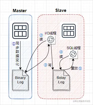 (3)同时主节点为每个I/O线程启动一个dump线程,用于向其发送二进制事件,并保存至Slave节点本地的ReplayLog中,Slave节点将启动SQL线程从中继日志中读取二进制日志,在本地重放,使得其数据和Master节点的保持一致,最后I/O线程和SQL线程将进入睡眠状态,等待下一次被唤醒。