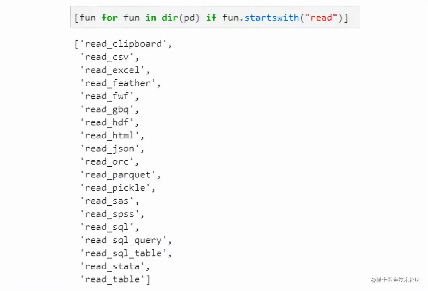 Pandas内置了丰富的数据读取API,且都是形如pd.read_xxx格式,通过对pd顶级接口方法进行过滤,得到Pandas中支持的数据读取API列表如下: