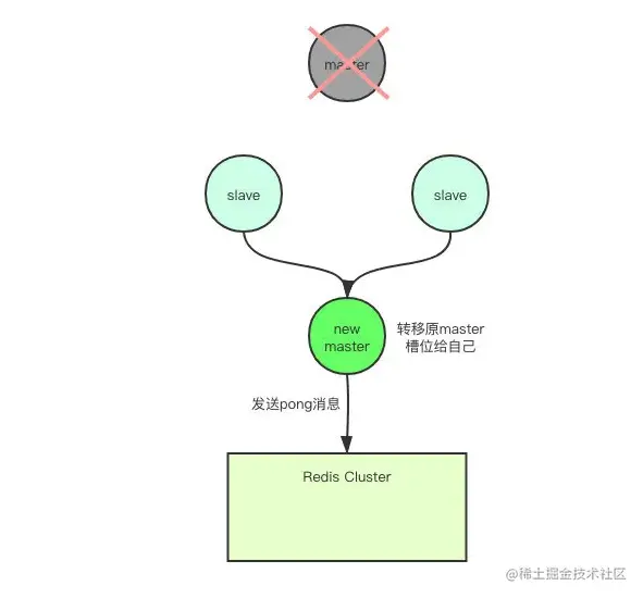 一旦节点A被标记为了客观下线,集群就会开始执行故障转移。其余正常运行的master节点会进行投票选举,从A节点的slave节点中选举出一个,将其切换成新的master对外提供服务。当某个slave获得了超过半数的master节点投票,就成功当选。