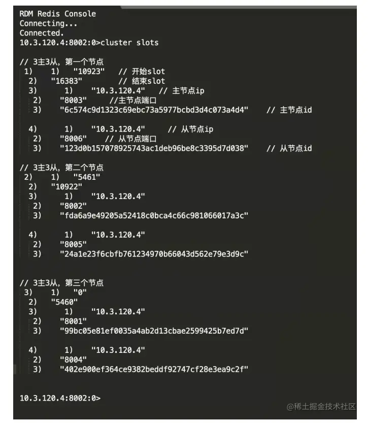 6、执行命令 cluster slots,查看集群各个节点的槽位分布