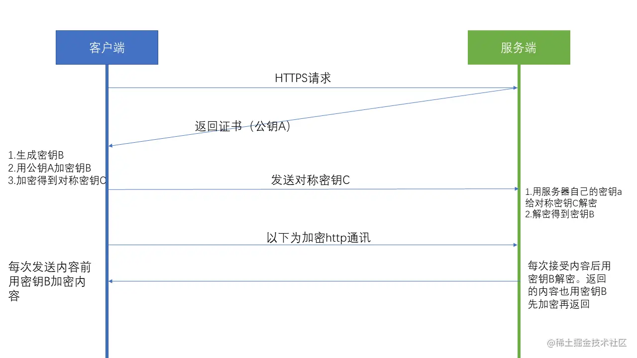 - 之后两者的http通讯都用这个密钥B进行对称加密解密。