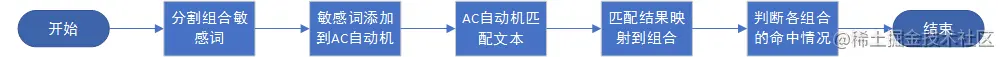 组合敏感词的匹配算法依然基于AC自动机算法。由于AC自动机只能判断单个词的命中情况,因此我们将组合敏感词分割成单个敏感词,并维护各敏感词与组合间的映射关系,在AC自动机算法运行结束后,只有某个组合对应的敏感词全部命中时,才能判断该组合敏感词命中。为此我们需要给AC自动机添加一些前置和后置的处理步骤,具体步骤如下: