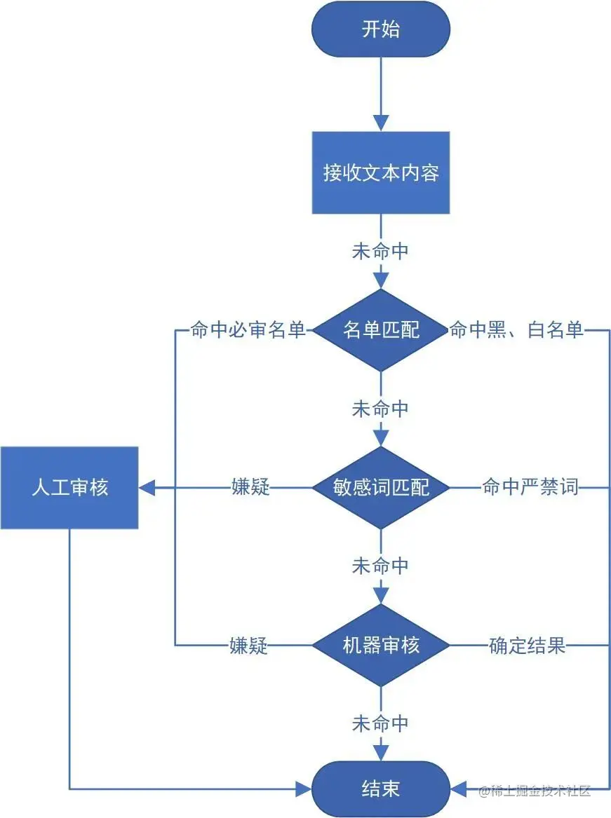 谛听系统是vivo的内容审核平台,保障了vivo各互联网产品持续健康的发展。谛听支持审核多种内容类型,但日常主要审核的内容是文本,下图是一个完整的文本审核流程,包括名单匹配、敏感词匹配、AI机器审核、人工审核四个环节。待审核文本需要顺次通过名单匹配、敏感词匹配、AI机器审核三个流程,若结果为嫌疑则需要人工审核,否则将直接给出确定的结果。