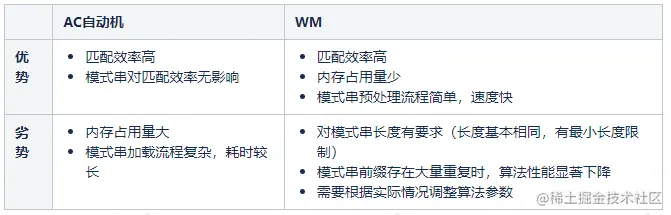 WM算法对模式串的长度和前缀存在一定的要求,可能会影响业务的使用。虽然AC自动机加载耗时长,内存占用大,但敏感词加载并不频繁,且服务器内存资源充足,所以我们最终选用AC自动机作为底层算法。