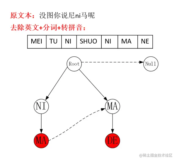 例如在下图所示的匹配流程中,左图是基于待匹配文本“朱朝阳和朋友”构建的拼音图,右图是基于拼音敏感词“PENG YOU”、“ZHAO YANG”、“NI MA”、“MA DE”构建的Trie树。左图的拼音图采用DFS算法遍历,算法最后访问的节点是蓝色节点“ZHAO”,此时拼音图中所有节点均被遍历了一次,已经达到了DFS的终止条件。但右图中Trie树上的状态位处于蓝色节点“ZHAO”的位置,并没有达到终止状态,若此时停止匹配,则会导致无法命中敏感词“ZHAO YANG”,故算法应继续运行,直到AC自动机匹配失败为止。