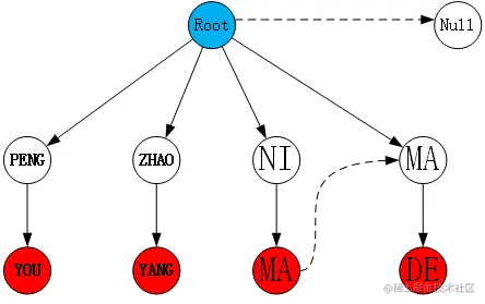 常规的AC自动机算法是逐字符匹配的,因此Trie树上每个节点存储一个字符,但拼音敏感词需要按照音节匹配,因此我们将Trie树的节点数据类型由char改为String,示例: