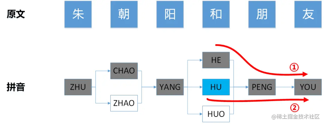 下图展示了文本内容与拼音的对应关系,由于存在多音字,因此存储拼音的数组从一维扩展到了二维,更像是“图”的数据结构,下文将其称为拼音图。拼音图的起始节点和终止节点之间存在多条路径,这些路径对应了多音字的所有排列组合情况,为了避免漏杀,我们需要使用AC自动机将这些路径都匹配一遍。