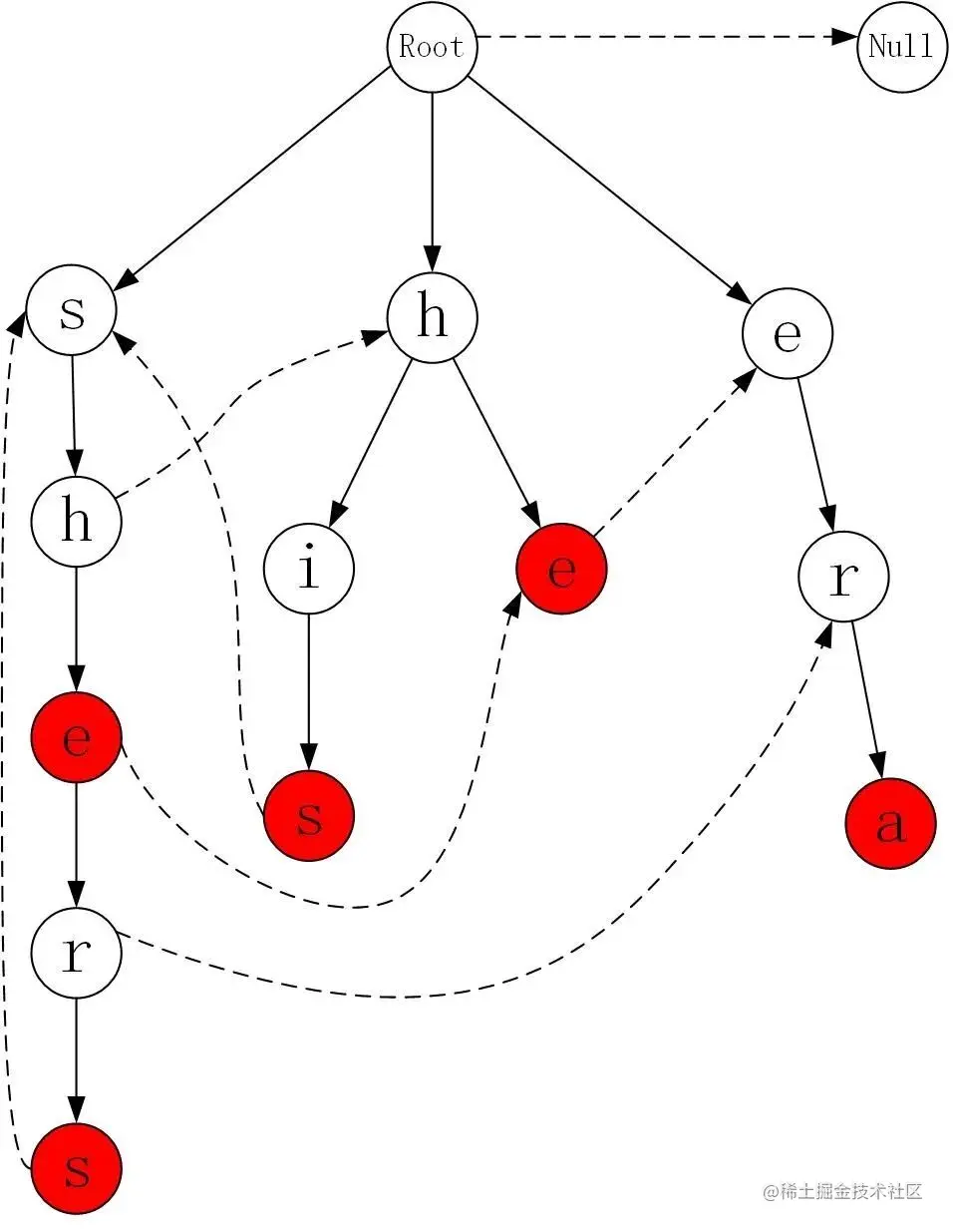 AC自动机在Trie树的基础上,为每个节点加入了Fail指针,上图使用虚线画出了部分节点的Fail指针,未画出虚线的节点,其Fail指针指向根节点。算法在某个节点匹配失败时,可以通过该指针转移到其他包含相同前缀的分支上继续匹配。例如匹配目标串“shis”时,对于前两个字符“sh”,Trie字典树匹配到左边字数的“h”节点上,由于该节点的子节点是字符“e”,与目标串的下一个字符“i”不匹配,因此算法通过Fail指针转移到中间子树的“h”节点上继续匹配,最终命中字符串“his”。