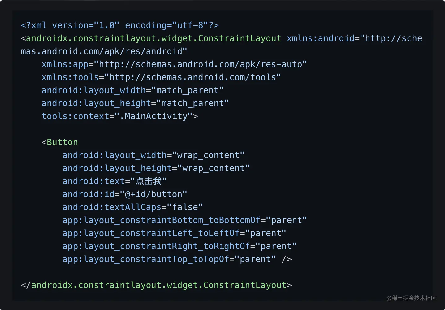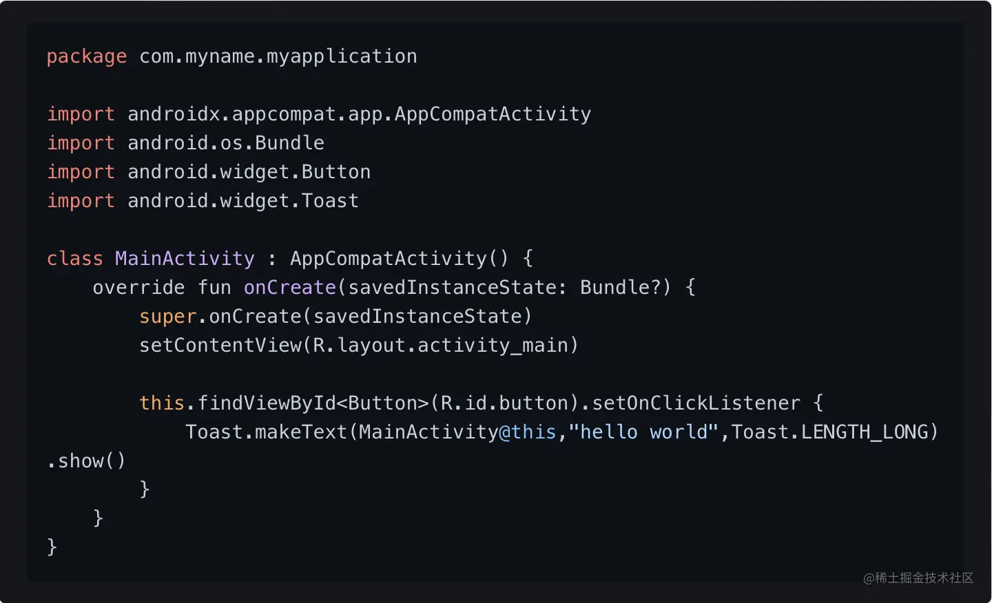 这段代码的逻辑大致是这样的,首先通过按钮的 id 找到这个按钮的对象(findViewById(R.id.button)),然后给 button 按钮增加一个点击监听器(setOnClickListener),当按钮被用户触发后,就会回调这个方法。而一旦这个匿名方法被触发,通过 Toast 弹出一串 hello world 的文字内容。