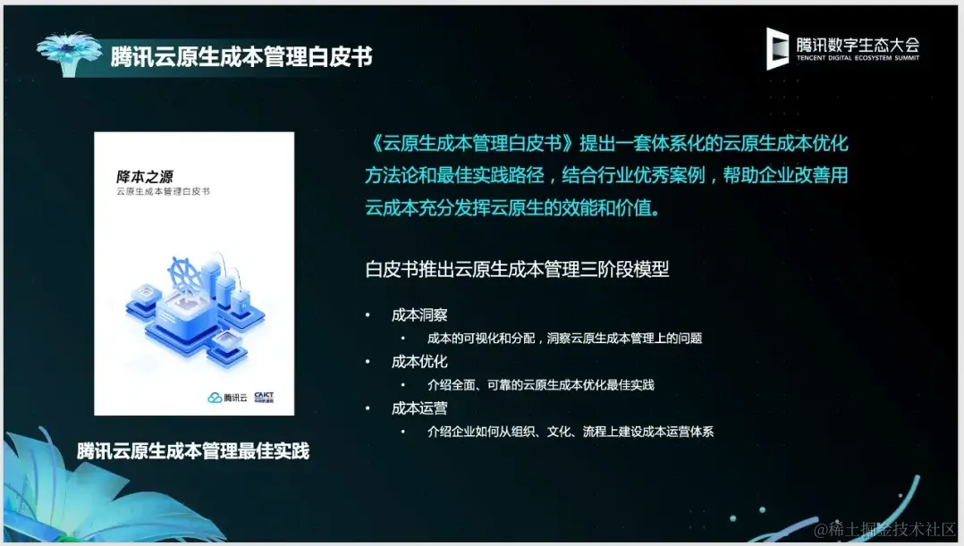 在11月4日举办的2021腾讯数字生态大会云原生专场上,腾讯云联合中国信通院、作业帮等率先在国内重磅发布了《降本之源-云原生成本管理白皮书》(简称白皮书),基于腾讯云在业内最大规模的 Kubernetes 实践经验,系统性呈现云原生成本优化方法论和最佳实践路径。
