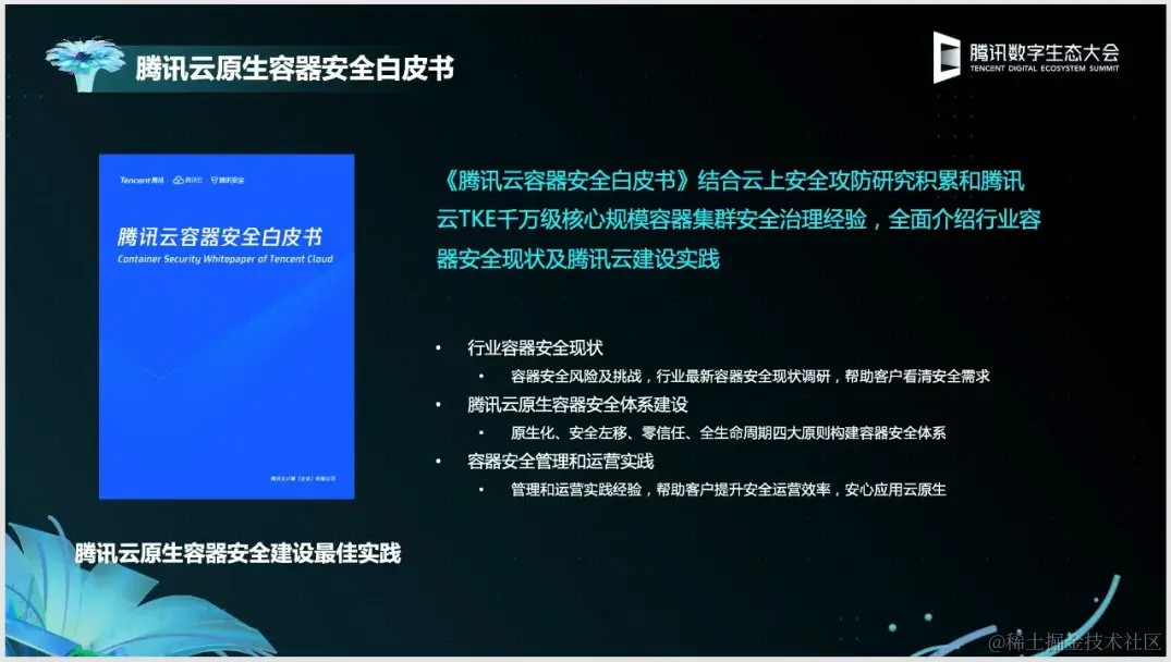 除了《云原生成本管理白皮书》,针对容器的安全难题,腾讯云容器服务TKE还联合腾讯安全云鼎实验室,发布了《腾讯云容器安全白皮书》。白皮书对腾讯云容器用户进行了深入的调研和走访,同时结合长期以来的容器安全运营实践,详细梳理并分析了容器环境所面临的安全威胁和挑战,并介绍了腾讯云在云原生容器安全建设上的思路、方案以及实践,希望以这样的方式共同推动云原生安全的发展。这也是国内首次大规模的对容器环境安全现状进行的分析总结。