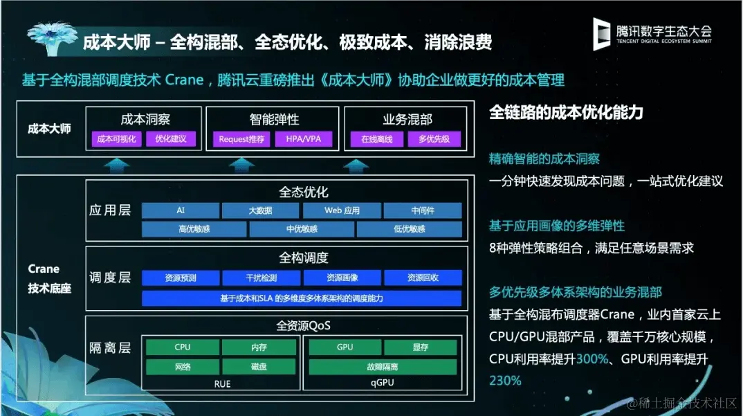 据介绍,成本大师具有全链路的成本优化能力,能够精确智能的进行成本洞察,一分钟发现资源浪费,并提供8种弹性策略组合,满足任意场景的弹性需求,而全构混部是业内首家云上支持 CPU/GPU 的混部产品,覆盖腾讯千万核资源规模。核心能力 qGPU,是强隔离的 GPU 虚拟化技术,该技术在业内首次实现了 GPU 算力、显存和故障的强隔离,支持算力精细切分共享和多优先级混部, GPU 利用率最高可提升230%。