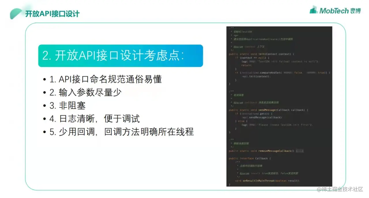 第二步是开放API接口设计,是直接开放给开发者调用的,所以经常要转化角色。针对如何调用这个接口,如何用起来更方便快捷,并且不用去考虑任何场景和问题,总结了以下几个要点。