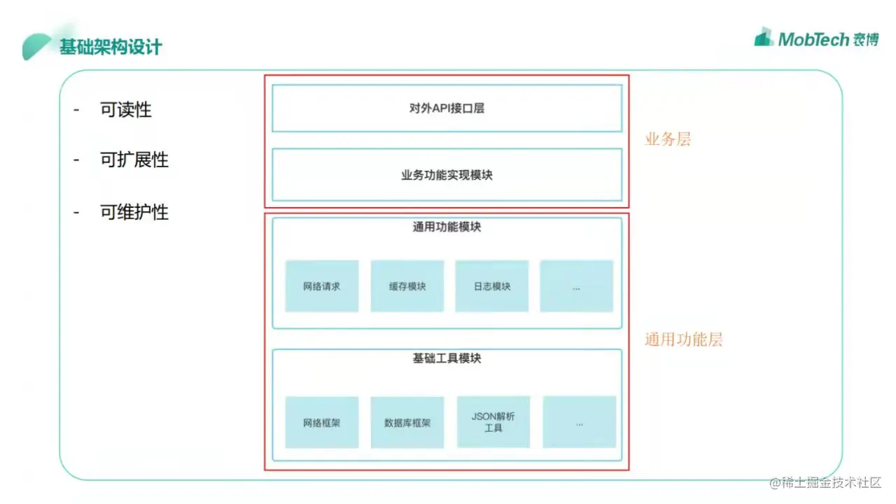 第一步是基础架构设计,一个好的架构可主要从可读性、可扩展性、可维护性三个方面进行考虑,即功能模块间相互独立,降低耦合度,保证结构清晰易于维护。通常我们可以把SDK架构简单分为两个层次:业务层和通用功能层。业务层可以独立成业务模块,包括开放API接口和业务功能实现,能用功能层可以分为两个模块,包手通用功能模块和基础工具模块。