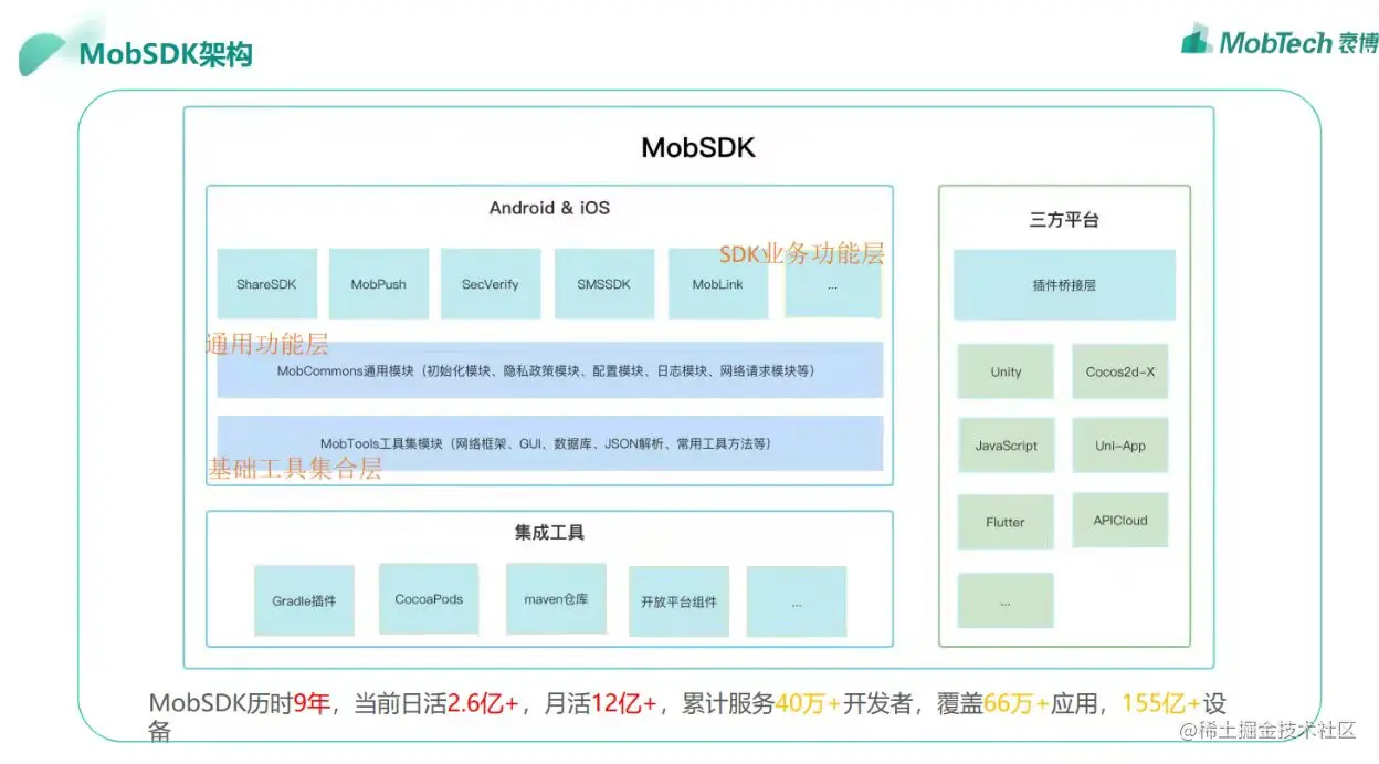 MobTech袤博科技开发者服务历时9年,现已覆盖全球近155亿+移动端设备,业务覆盖营销、金融、商业地理等多个垂直行业,同时为政府业务提供支持。对于App开发者来说,会经常面临架构选型以及SDK接入的一些痛点和问题,今天从“SDK架构设计”这个主题出发,分享MobTech袤博科技如何系统化打造SDK服务。