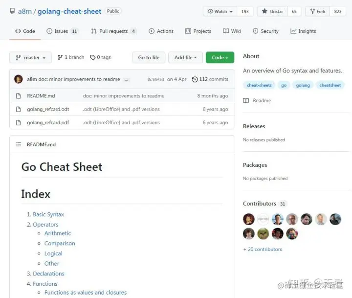 golang-cheat-sheet是目前GitHub上最流行的golang代码速查表,目前Star 6000+。