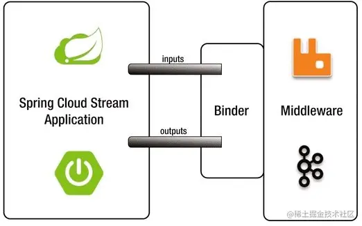 Spring Cloud Stream 由一个中立的中间件内核组成。Spring Cloud Stream 会注入输入和输出的 channels,应用程序通过这些 channels 与外界通信,而 channels 则是通过一个明确的中间件 Binder 与外部 brokers 连接。