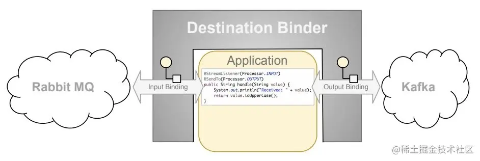 另外还有一个概念叫 Binding,Binding 在消息中间件与应用程序提供的 Provider 和 Consumer 之间提供了一个桥梁,实现了开发者只需使用应用程序的 Provider 或 Consumer 生产或消费数据即可,屏蔽了开发者与底层消息中间件的接触。Binding 包括 Input Binding 和 Output Binding。