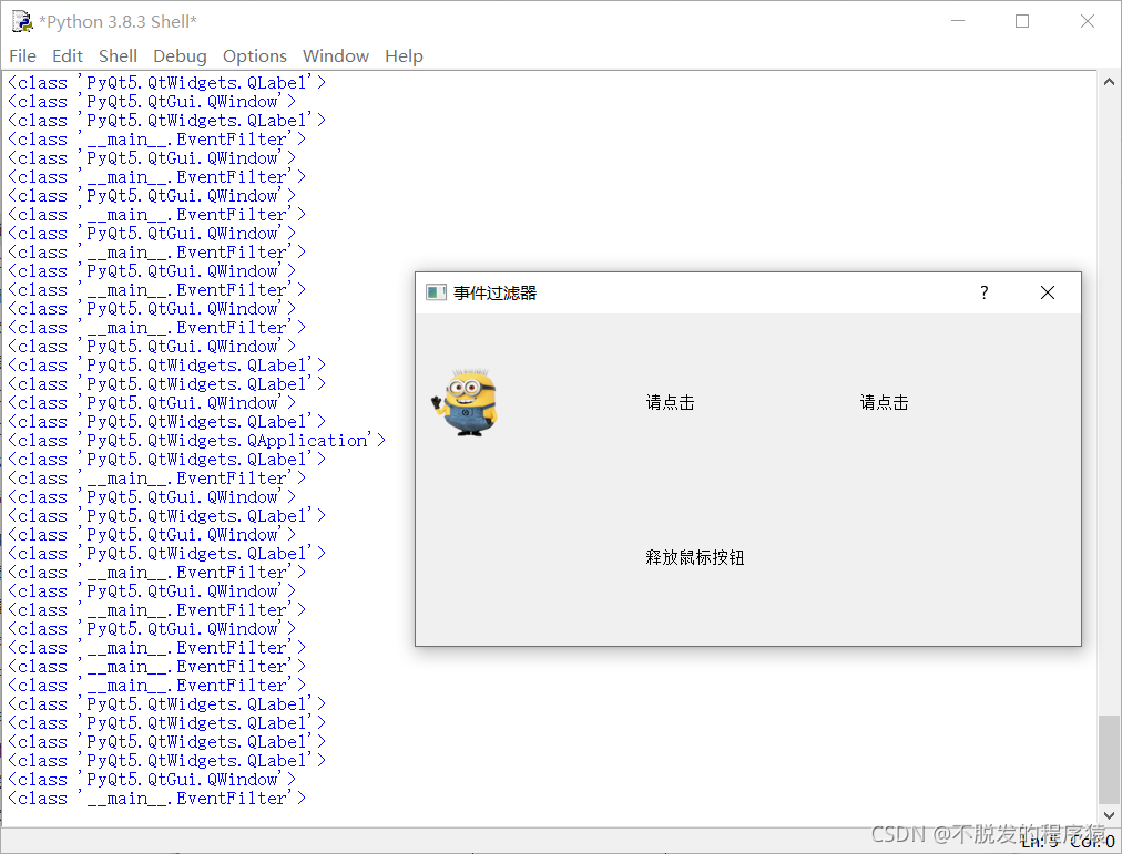 PyQt使用notify()来分发事件,要想在任何事件处理器之前捕获事件,唯一的方法就是重新实现QApplication的notify(),在实践中,在调试时才会使用这种方法,实际中基本用不多,这里不再赘述了。